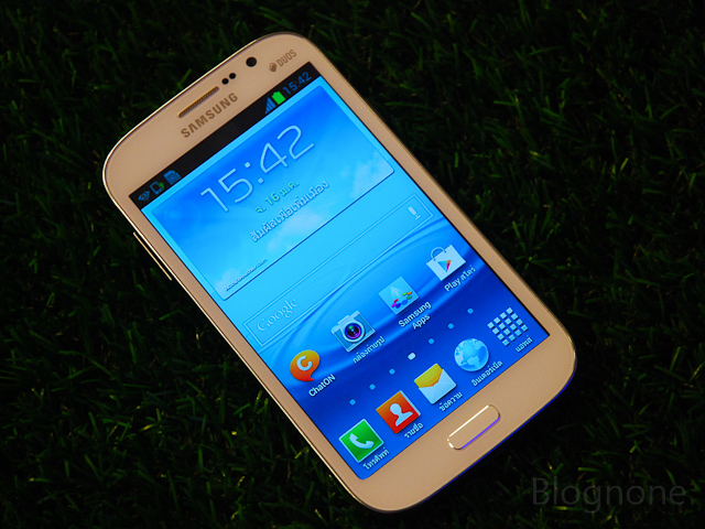 รูปทรงของ Galaxy Grand Duos เหมือนกันกับ Galaxy S III เป๊ะๆ แต่ด้วยหน้าจอความละเอียด 800x480 พิกเซล ตัวเครื่องจะกว้างกว่าพอสมควร (ผมลองจับแล้วพอกับ Galaxy Note ตัวแรก)