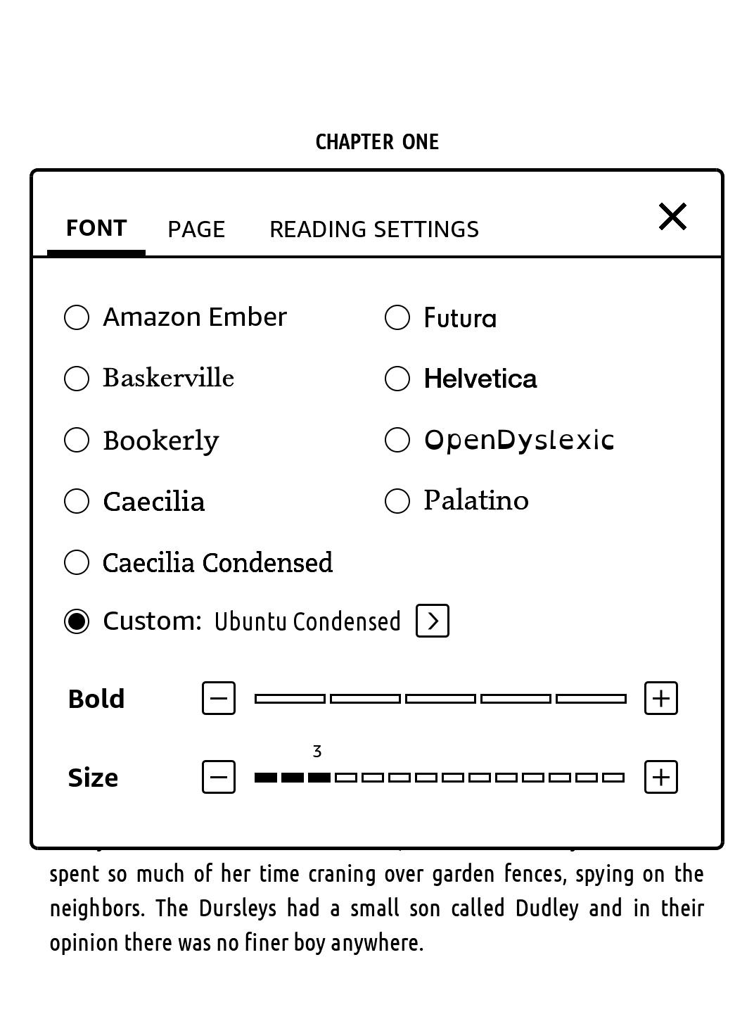 หากต้องการใช้ฟอนต์ติดตั้งเอง ต้องแปลง e-book เป็นฟอร์แมต AZW3 (ไม่แต่ใจว่าต้อง AZW3 เท่านั้นหรือเปล่า แต่ที่ไม่ได้แน่คือ mobi)