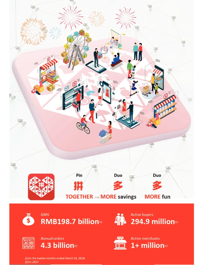 Pinduoduo ก่อตั้งขึ้นโดย Colin Huang อดีตวิศวกร Google ในปี 2015 โดยมีนักลงทุนรายใหญ่ เช่น Sequoia Capital China และ Tencent ซึ่ง Pinduoduo ทำธุรกิจอีคอมเมิร์ซ มีการใช้โซเชียลเน็ตเวิร์คเป็นเครื่องมือสำหรับการติดต่อสื่อสารระหว่างร้านค้า โดยยอดผู้ใช้งานบนแพลตฟอร์มแบบแอคทีฟต่อเดือนเฉลี่ยในรอบ 12 เดือนสิ้นสุดเดือนมีนาคมอยู่ที่ 103 ล้านคน มีปริมาณสินค้ารวม (Gross Merchandise Volume หรือ GMV) ทั้งปี 2017 อยู่ที่ 141,200 ล้านหยวน และมีออร์เดอร์ทั้งหมด 4,300 ล้านครั้ง ซึ่ง Pinduoduo ถือเป็นหนึ่งในผู้นำตลาดอีคอมเมิร์ซของจีนในแง่ของ GMV และจำนวนออร์เดอร์