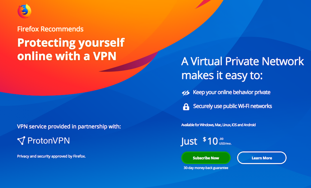Mozilla ระบุว่า VPN เป็นทางเลือกที่ดีในการรักษาความเป็นส่วนตัว แต่ผู้ให้บริการ VPN มีหลากหลาย ซึ่ง Mozilla จะต้องเลือกผู้ให้บริการที่เป็นไปตามมาตรฐานของ Mozilla เท่านั้น และหลังจากพิจารณาด้วยปัจจัยต่าง ๆ แล้ว Mozilla จึงเลือก ProtonVPN เป็นพาร์ทเนอร์