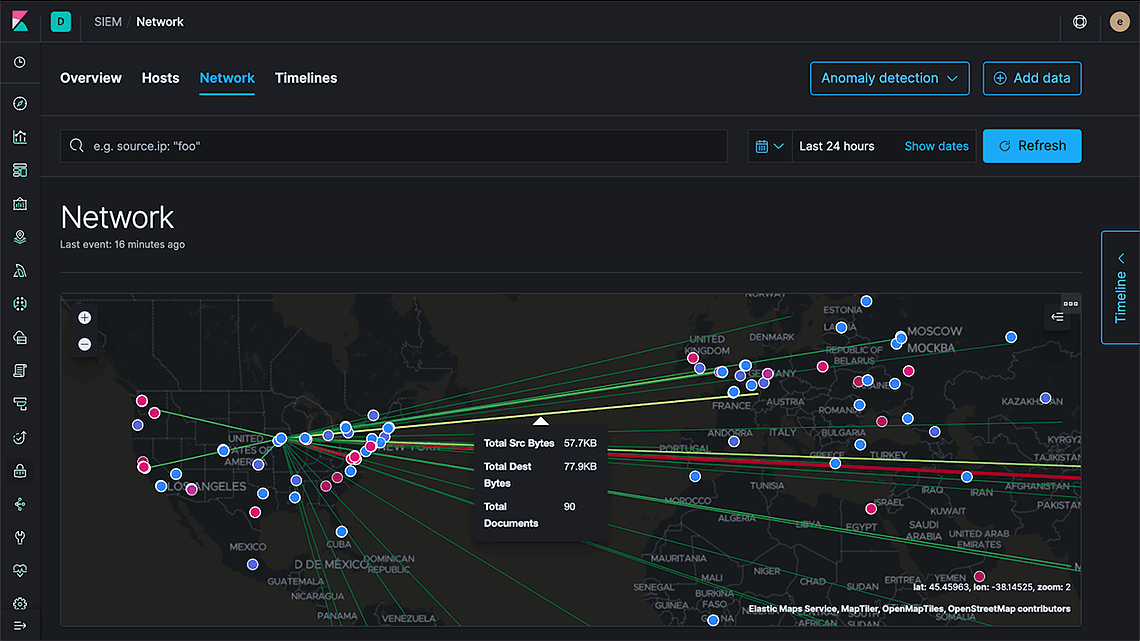 • Elastic SIEM ระบบวิเคราะห์การโจมตีที่เปิดตัวในเวอร์ชัน 7.2 เพิ่มฟีเจอร์ pew pew map สำหรับการค้นหาข้อมูลแบบเรียลไทม์บนแผนที่