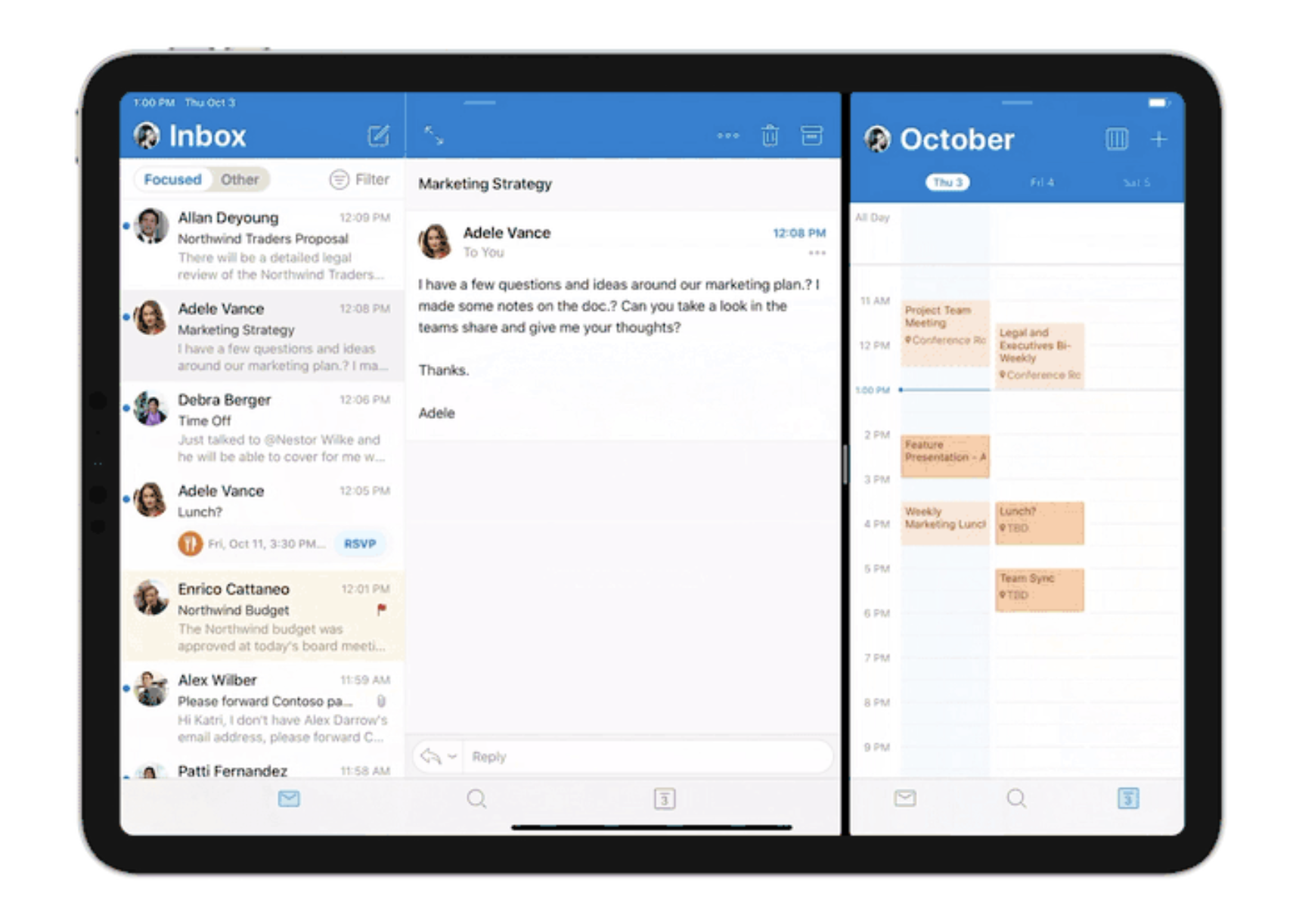 ฟีเจอร์แรกคือ Split View สำหรับเปิดหน้า Outlook บน iPad ได้ทีละหลาย ๆ หน้า เช่น เปิดอีเมลพร้อมปฏิทิน ฟีเจอร์นี้จะเปิดให้ใช้งานภายสัปดาห์หน้า ส่วนฟีเจอร์ลากวางสำหรับอำนวยความสะดวกในการคัดลอกและแปะรูปภาพหรือข้อความยังไม่ระบุว่าจะมาเมื่อไร บอกเพียงว่าอยู่ในแผนการอัพเดต