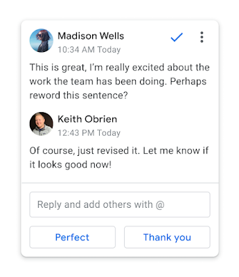 Google ประกาศเพิ่มฟีเจอร์ Smart Reply สำหรับ Google Docs เพื่อการตอบคอมเมนท์ในเอกสารโดยจะแนะนำคำตอบที่เหมาะสมให้