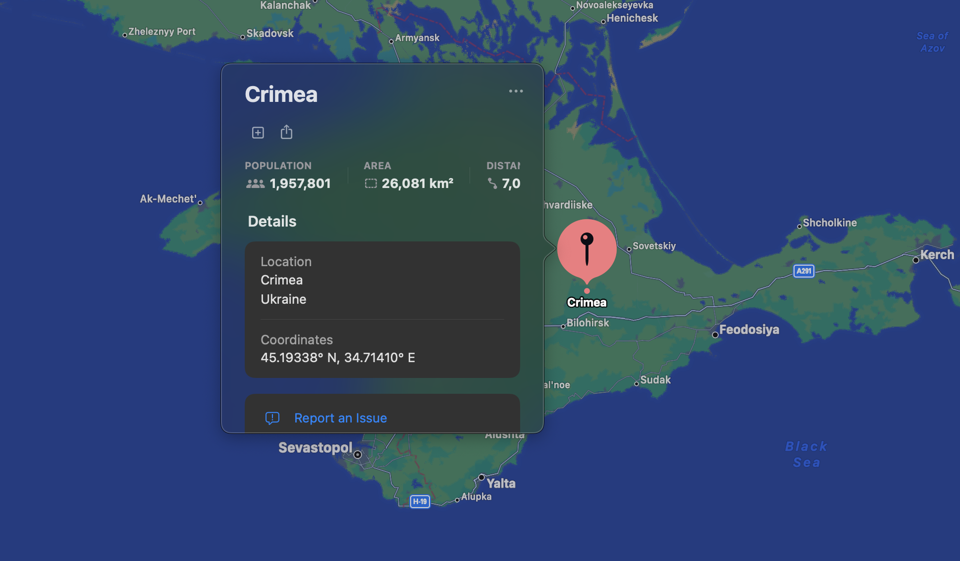 Apple ปรับปรุงระบบแผนที่ Apple Maps เล็กน้อย โดยตอนนี้เปลี่ยนไปแสดงพื้นที่ไครเมียเป็นส่วนหนึ่งของประเทศยูเครนสำหรับผู้ใช้งานนอกรัสเซีย