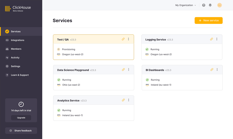 บริการ ClickHouse Cloud อาศัยโครงสร้างของคลาวด์รายหลัก ได้แก่ AWS, Azure, และ GCP โดยช่วงแรกจะรองรับเฉพาะ AWS ก่อน จากนั้นจะคิดค่าบริการเป็นรายนาที ตามปริมาณการเก็บข้อมูล, ประมวลผล, อ่าน, และเขียน นอกจากนี้ตัว Cloud Console จะให้บริการเพิ่มเติม ทั้งบริการดึงข้อมูลเข้า (ingestion), การแสดงข้อมูล (visualization), การใช้งานกับโปรแกรมภาษาต่างๆ, และไคลเอนต์