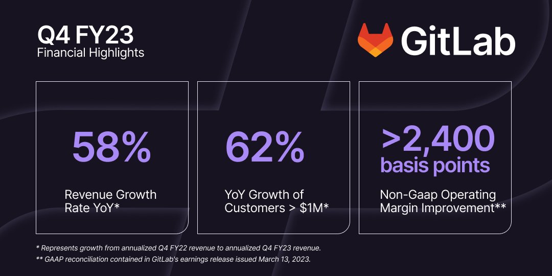 GitLab รายงานผลประกอบการของไตรมาสที่ 4 ตามปีการเงินบริษัท 2023 สิ้นสุดเดือนมกราคม 2022 มีรายได้รวม 122.9 ล้านดอลลาร์ เพิ่มขึ้น 58% จากช่วงเดียวกันในปีก่อน และขาดทุนสุทธิตามบัญชี GAAP 38.7 ล้านดอลลาร์