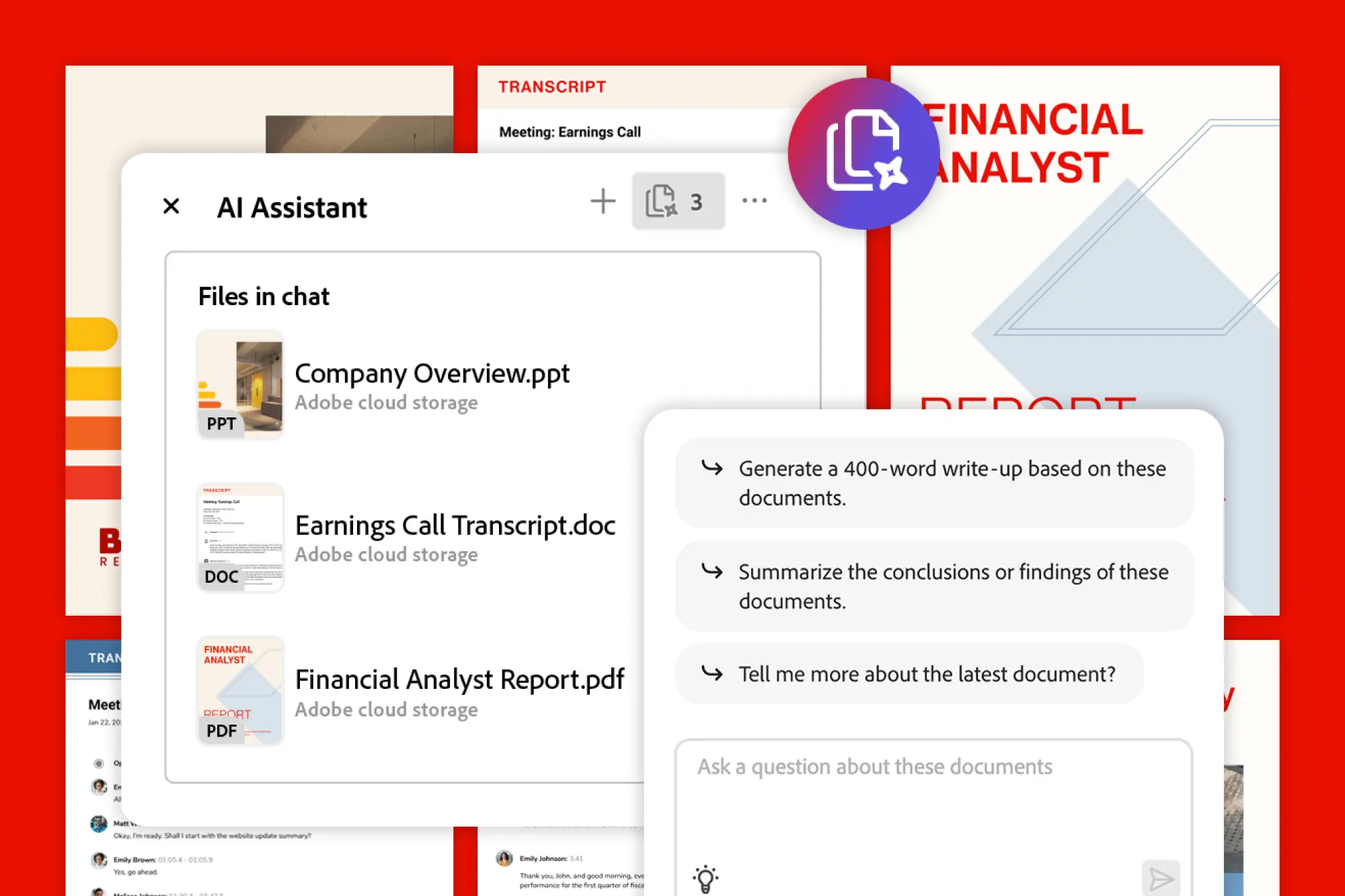ล่าสุด Adobe เพิ่มฟีเจอร์ให้ Acrobat AI Assistant สามารถอ่านเอกสาร PDF หลายๆ ไฟล์แล้วสรุปเนื้อหาให้ได้ด้วย รวมถึงฟีเจอร์ช่วยตรวจจับว่าเป็นเอกสารถอดเสียงการประชุม (meeting transcript) เพื่อใช้โมเดลสรุปประชุมออกมาได้อย่างแม่นยำมากขึ้น