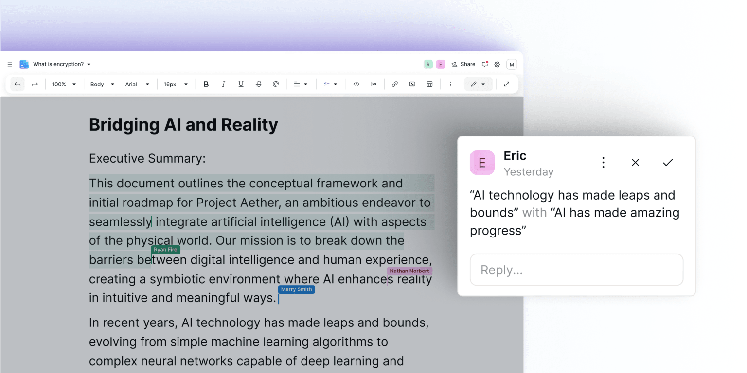 Proton Docs เปิดให้บริการฟรีสำหรับทุกคนที่มี Proton Drive รองรับเอกสาร .docx, .txt. .md, .html มีฟีเจอร์ช่วยกันแก้ไขเอกสารร่วมกันหลายคนแบบเรียลไทม์