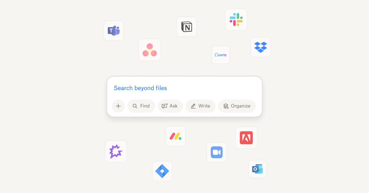 นอกจากนี้ Dropbox ยังอัปเดตรองรับการเชื่อมต่อกับแพลตฟอร์มทำงานได้แก่ Slack, Microsoft Teams, Canva, Jira ซึ่งผู้ใช้งานสามารถใช้ Dropbox Dash ค้นหาไฟล์หรือข้อมูลหรือสรุปเนื้อหาบนแพลตฟอร์มเหล่านี้ได้ด้วย