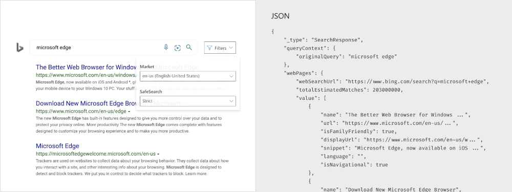 Bing Search API เป็นการเปิดช่อง API ให้บริษัทอื่นสามารถเรียกผลการค้นหาของ Bing ไปใช้งานเป็น JSON ได้โดยตรง (ถือเป็นบริการตัวหนึ่งของ Microsoft Azure) บริการตัวนี้ได้รับความนิยมจากหน่วยงานที่ต้องการนำผล search ไปใช้งานอื่นต่อ ส่วนหนึ่งเพราะ Google Search ไม่ได้เปิด API แบบเดียวกันให้ คู่แข่งรายอื่นในวงการยังมี Brave Search API ให้เลือกใช้งานแทน ซึ่งบริการ AI หลายตัวอย่าง Cohere, Perplexity, Mistral ก็เลือกใช้ข้อมูลจาก Brave Search API อยู่แล้ว