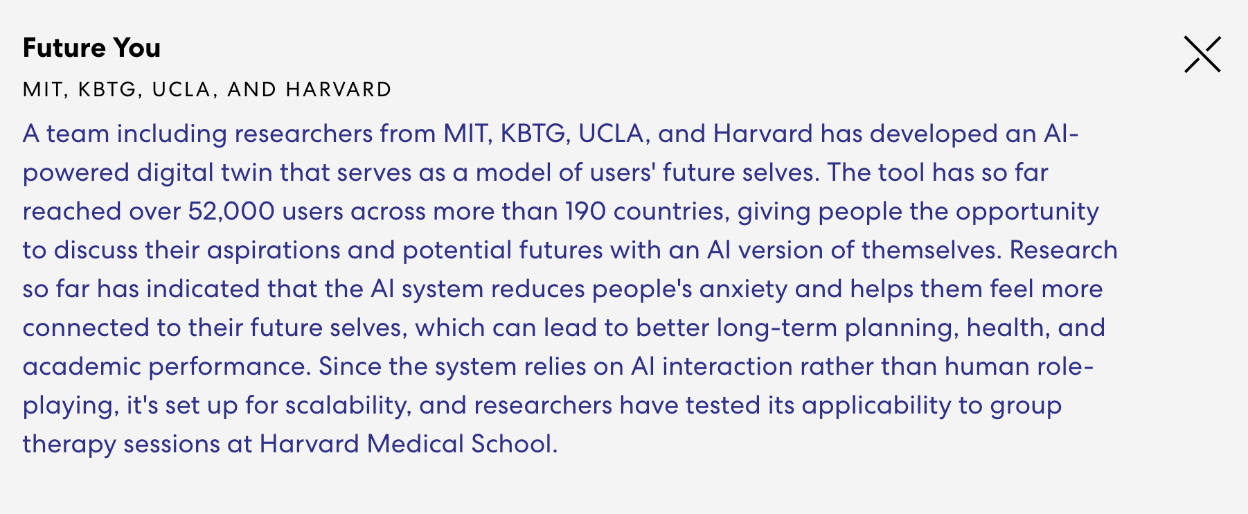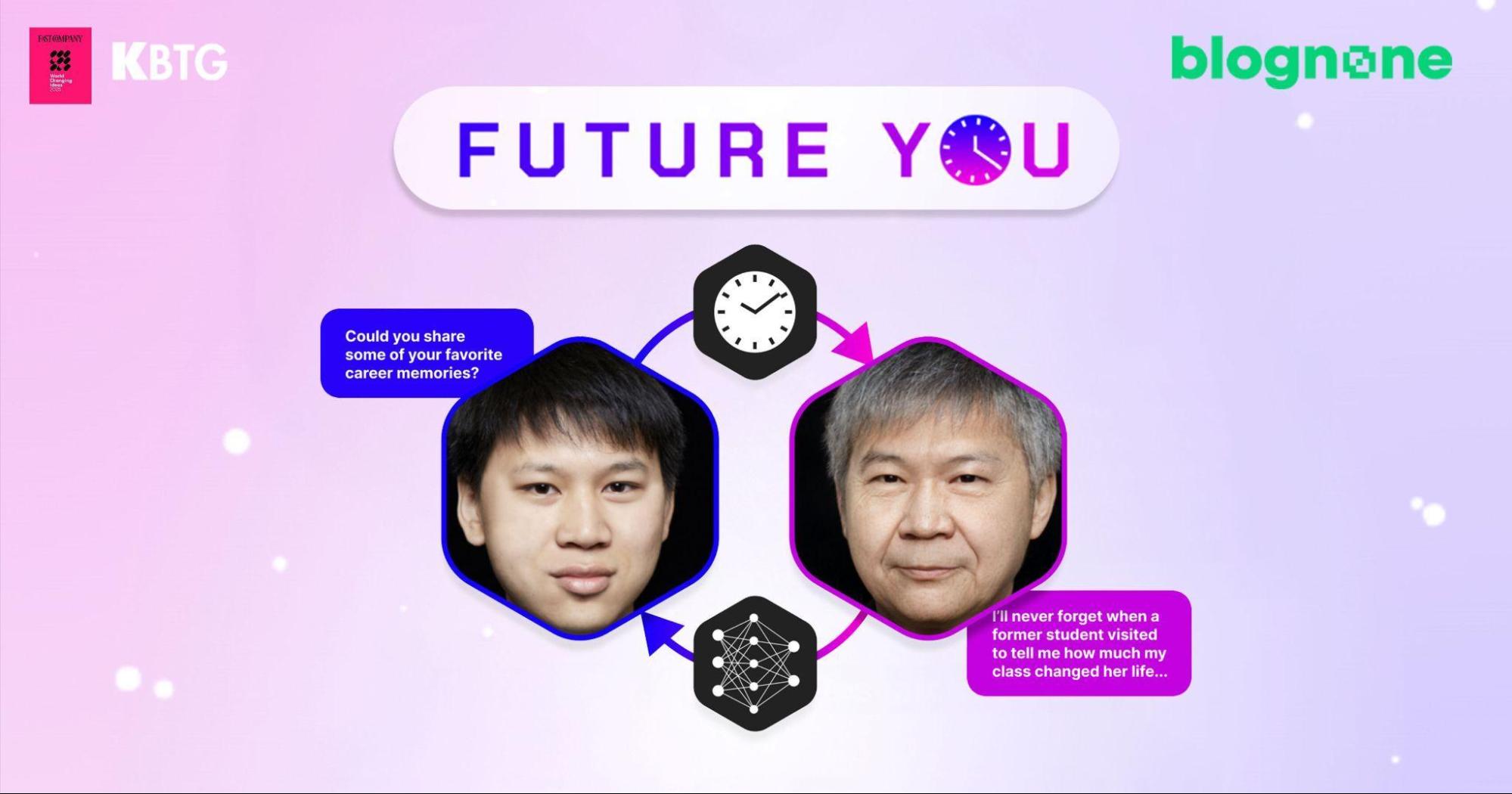 ปัญญาประดิษฐ์ทุกวันนี้มักถูกมองในฐานะเครื่องมือเพิ่มประสิทธิภาพการทำงานหรือใช้ปัญญาประดิษฐ์แทนที่มนุษย์ แต่ KBTG พลิกมุมมองการใช้ AI ว่า ปัญญาประดิษฐ์สามารถช่วยให้มนุษย์ "เบ่งบาน" (Human Flourish) ด้วยการใช้งานที่เหมาะสม โดยนำเสนอโครงการ Future You ที่ให้ผู้ใช้สามารถปรึกษาปัญหาและความกังวลของชีวิตกับตัวเองในวัย 60 ปี โดยล่าสุดโครงการนี้ได้ขึ้นทำเนียบ World Changing Ideas 2025 จากนิตยสาร Fast Company สื่อชั้นนำระดับโลก