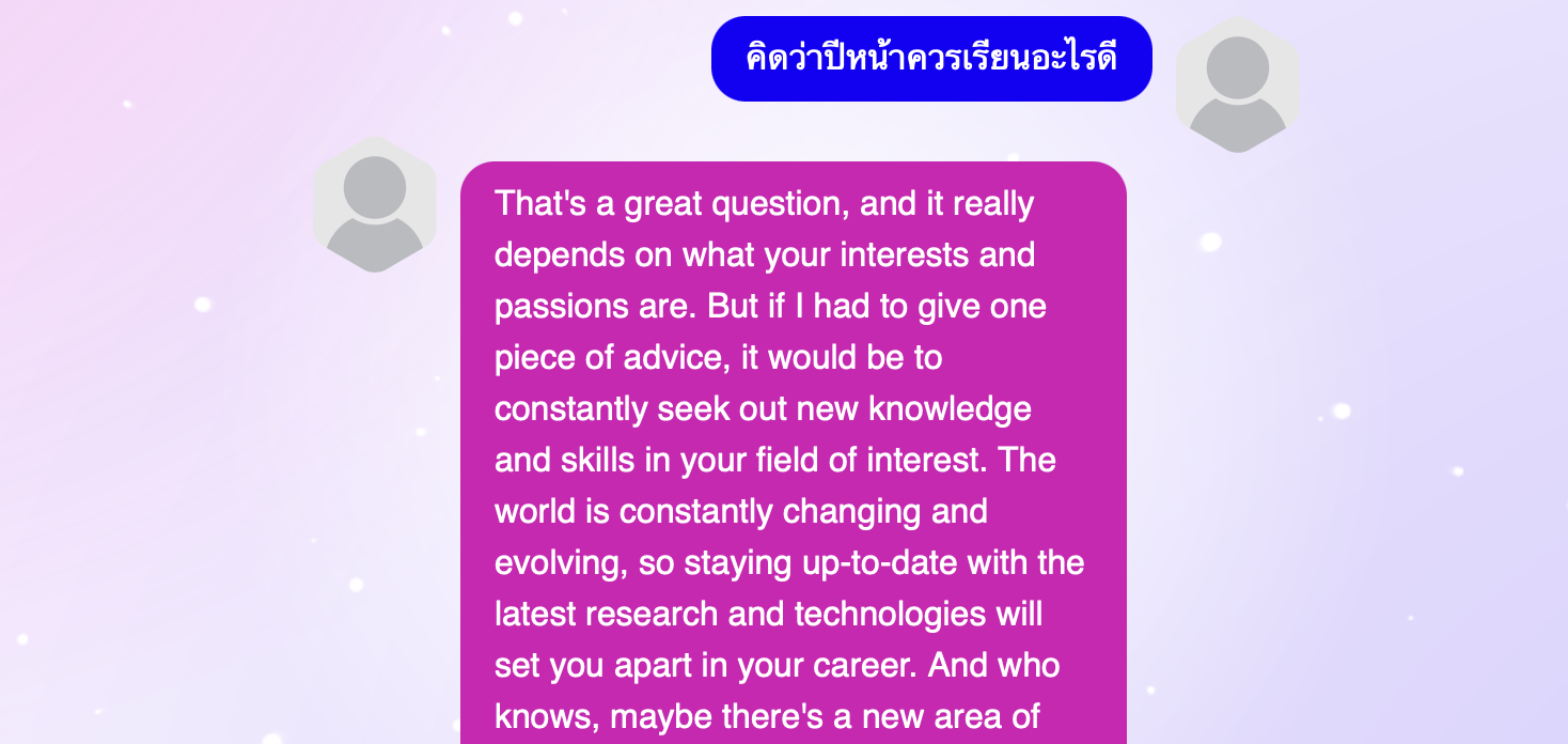 และหลังจากนี้จะมีการศึกษาถึงการขยายรูปแบบการใช้งานต่อไป เช่น การสร้างตัวตนเพื่อให้คำปรึกษากับเยาวชนระดับมัธยมที่จะใช้ปัญญาประดิษฐ์เข้าไปเสริมสร้าง Growth Mindset ที่เสริมให้เด็กๆ มีความเชื่อในตัวเอง, การใช้เพื่อบำบัดสุขภาพจิต ที่ทุกวันนี้จิตแพทย์มีจำกัด และไม่สามารถพูดคุยกับคนไข้ได้ตลอดเวลา การใช้ปัญญาประดิษฐ์เปิดทางให้คนไข้ หรือผู้ใช้ที่ต้องการสามารถมีปัญญาประดิษฐ์พูดคุยได้ตลอดเวลาและระบบสามารถมอนิเตอร์ได้