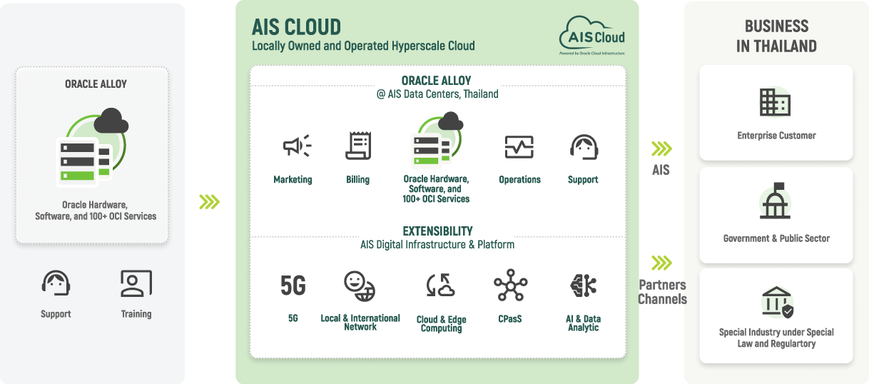 บริการตัวนี้คือการยกระบบคลาวด์ของ Oracle Cloud Infrastructure (OCI) ซึ่งเป็น Top 4 ผู้ให้บริการคลาวด์รายใหญ่ของโลก (Hyperscale Cloud) มาให้บริการโดย AIS ใช้ศูนย์ข้อมูลในประเทศไทยของ AIS เอง ข้อมูลอยู่ในประเทศ รองรับมาตรฐานความปลอดภัยและ compliance ต่างๆ ตามระบบกฎหมายของประเทศไทย