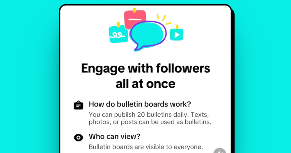 TikTok ยืนยันการทดสอบฟีเจอร์ใหม่เรียกชื่อว่า "Bulletin Boards" เพื่อให้แบรนด์สินค้าหรือครีเอเตอร์ สามารถสื่อสารข้อความในห้องแชททางเดียวแบบ one-to-many ให้กับผู้ติดตามได้ ซึ่งวิธีการทำงานนั้นก็คล้ายกับ Broadcast ของ Instagram นั่นเอง