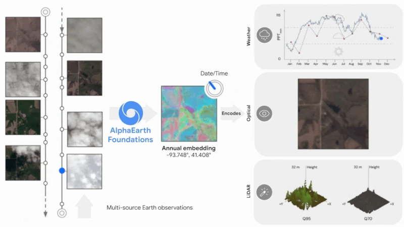 ทุกวันนี้เรามีภาพถ่ายดาวเทียมจำนวนมหาศาล ให้ข้อมูลโลกแบบเกือบเรียลไทม์ ปัญหาคือข้อมูลใหญ่ระดับ petabyte มีความซับซ้อนสูง โมเดล AlphaEarth Foundations ทำหน้าที่ย่อยข้อมูลจากแหล่งต่างๆ เช่น ภาพถ่ายดาวเทียม เรดาร์ ซิมูเลชันสภาพอากาศ ฯลฯ ให้อยู่ในรูปเวกเตอร์ embedding เพื่อให้นำไปประมวลผลต่อได้ง่าย
