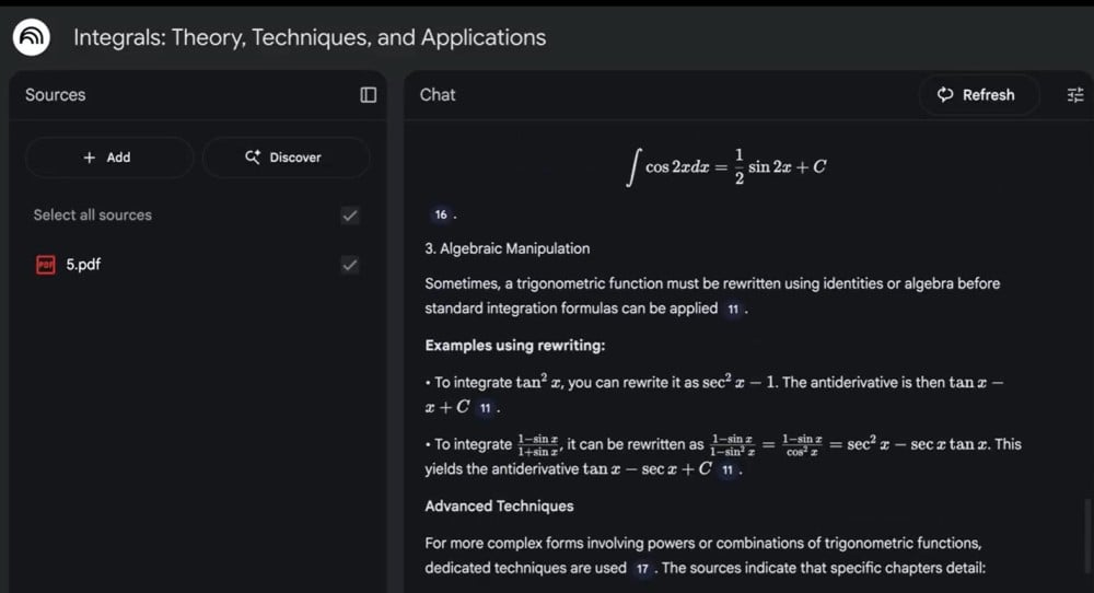 NotebookLM เพิ่มฟีเจอร์เล็กๆ แต่สำคัญของวงการคณิตศาสตร์ นั่นคือการรองรับการเขียนสัญลักษณ์และสมการแบบ LaTeX (ที่ใช้เป็นมาตรฐานของวงการ) แล้ว ทำให้ NotebookLM แสดงสัญลักษณ์คณิตศาสตร์ได้สวยงาม