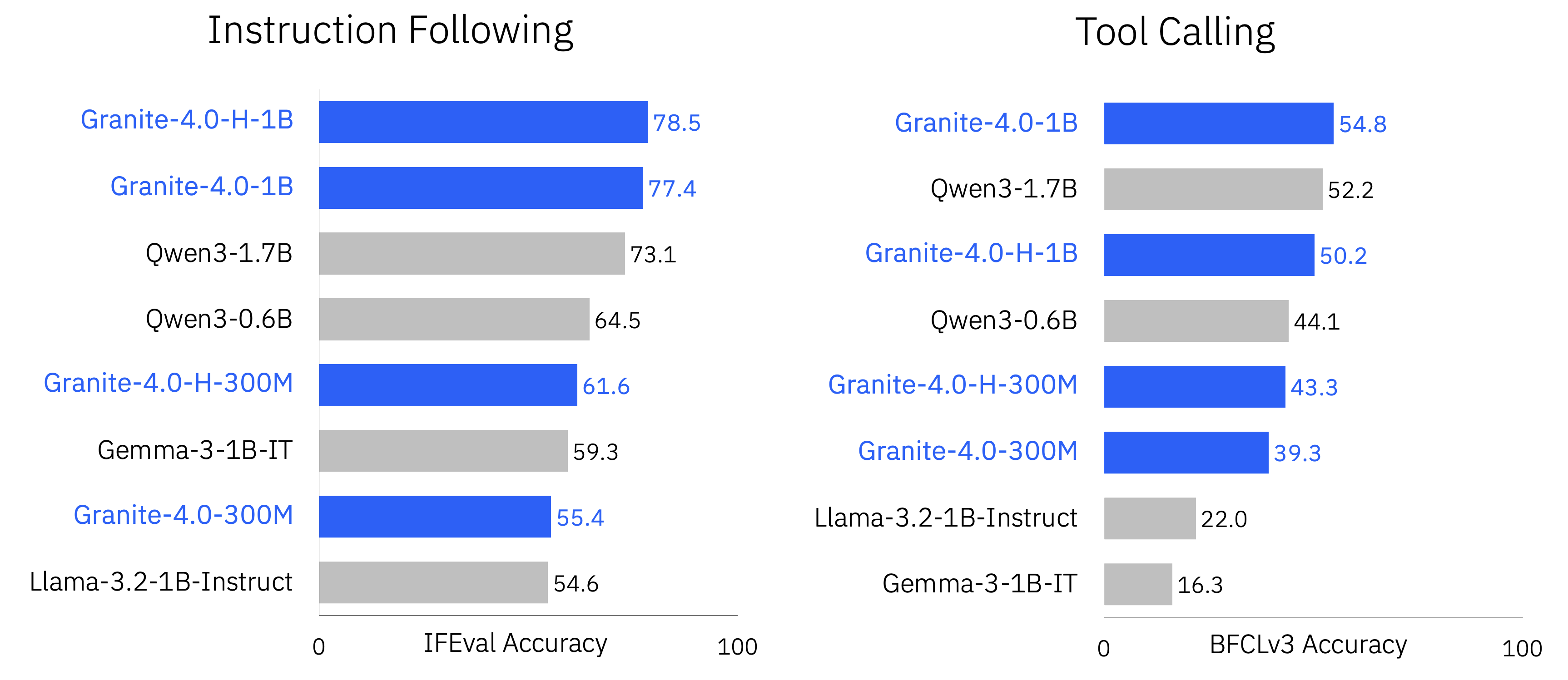 Granite 4.0 Nano มีทั้งเวอร์ชันใช้สถาปัตยกรรมไฮบริด (Mambo+Transformer) และแบบดั้งเดิม (Transformer) สำหรับรันบนสภาพแวดล้อมที่ยังไม่รองรับ Mambo (เช่น Llama.cpp) คู่แข่งของมันในขนาดใกล้ๆ กันคือ Qwen3-1.7B, Qwen3-0.6B, Gemma-3-1B, Gemma-3-270M, Llama-3.2-1B แต่จุดเด่นของ Granite 4.0 Nano คือประสิทธิภาพที่เหนือกว่า ปฏิบัติตามคำสั่งได้ดีกว่า จากผลเบนช์มาร์คที่วัดออกมาได้