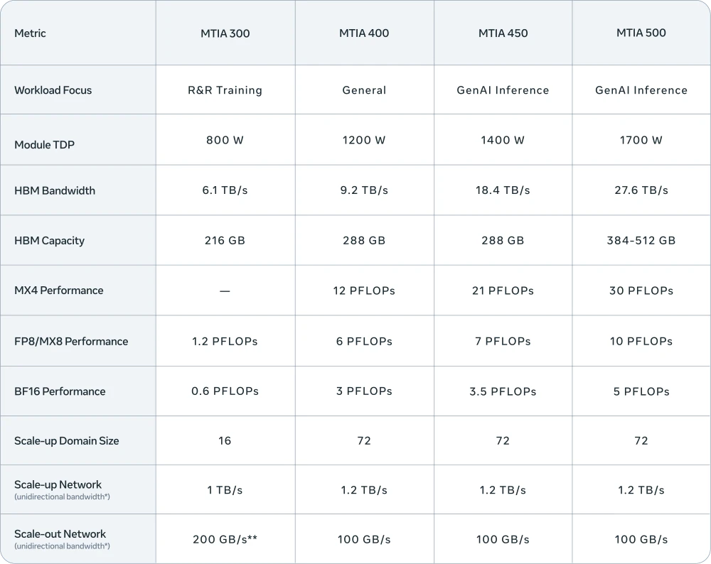 • MTIA 450 ปรับแต่งมาเพื่องาน GenAI โดยเฉพาะ เพิ่มแบนด์วิดท์ของแรม HBM สองเท่าจากรุ่น 400 มีกำหนดใช้งานช่วงต้นปี 2027