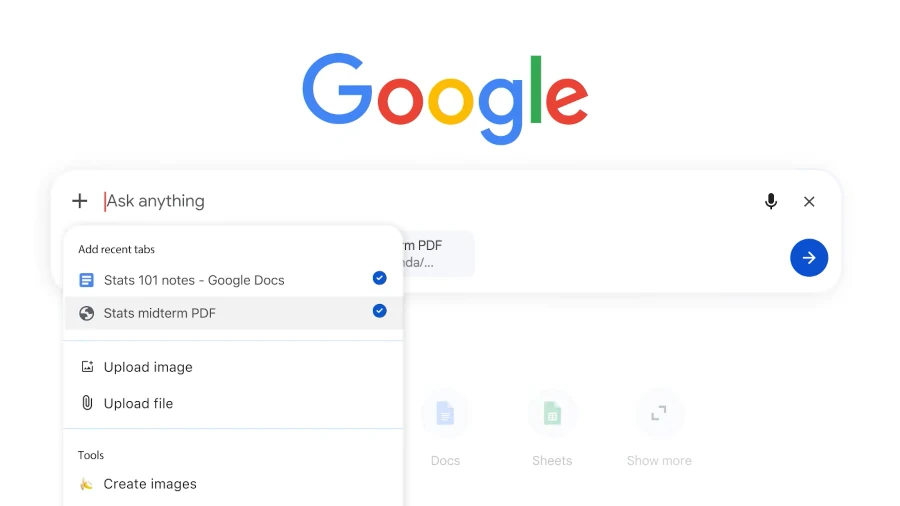 • AI Mode สามารถค้นหาและสรุปข้อมูลเฉพาะบางแท็บที่เปิดไว้ วิธีใช้งานคือกดปุ่ม + หน้ากล่อง search แล้วเลือกเฉพาะแท็บที่ต้องการได้ (เลือกผสมกับอย่างอื่นด้วยก็ได้ เช่น รูปภาพ ไฟล์)