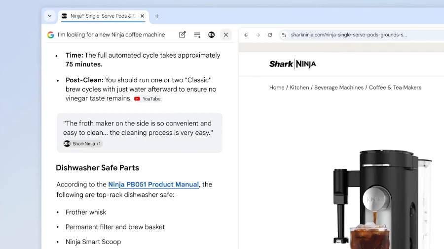 • Chrome จะเปิดลิงก์หน้าเว็บที่กดจาก AI Mode แบบแบ่งครึ่งจอ (side-by-side) ทำให้เราไม่ต้องเปิดแท็บใหม่ ไม่ต้องสลับแท็บใดๆ และสามารถถามคำถามต่อเนื่องให้ AI จากหน้าเว็บที่เปิดขึ้นมาใหม่ได้ด้วย