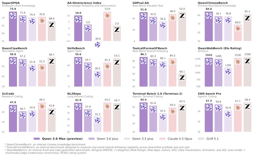 ทาง Artificial Analysis จัดให้ Qwen3.6-Max มีคะแนนความฉลาดรวมเป็นที่ 4 ร่วมกับ Meta Muse Spark, และ Claude Sonnet 4.6 (max) แต่หากนับเฉพาะด้านการเขียนโค้ดยังเป็นอันดับ 6