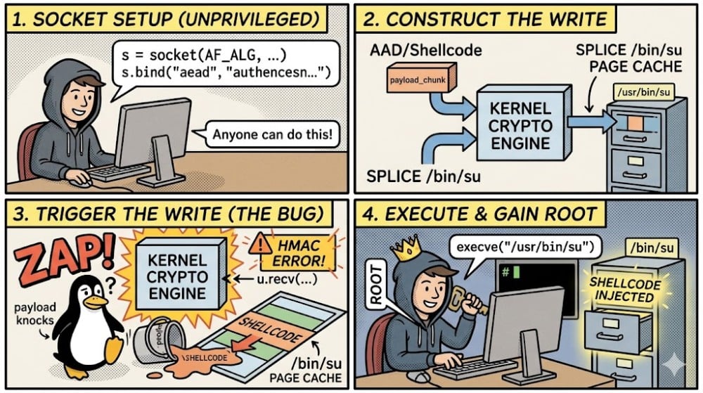 ความพิเศษของ Copy.Fail คือมันไม่ได้อาศัยการเจาะทะลุกระบวนการป้องกันของเคอร์เนลตามปกติ แต่โค้ดไพธอนสั้นๆ สามารถเจาะทะลุเป็น root ได้ทันที โดยไม่ต้องสแกน หรือรันซ้ำ