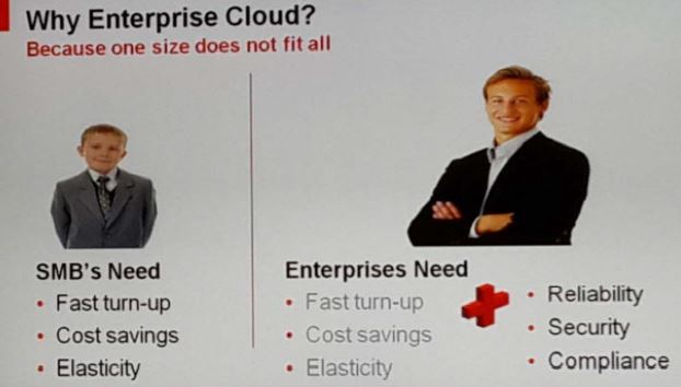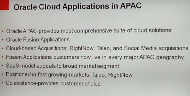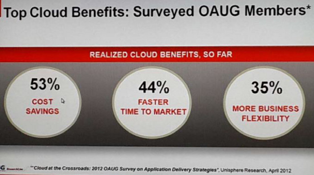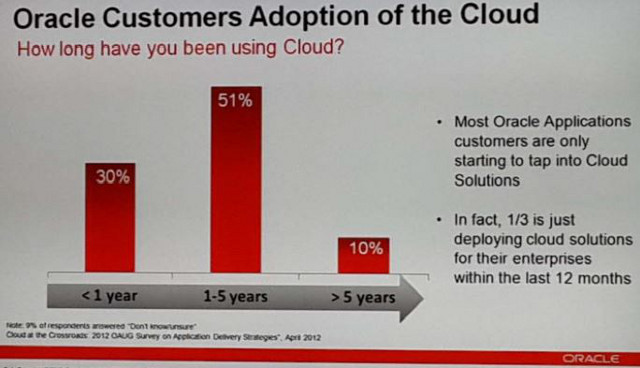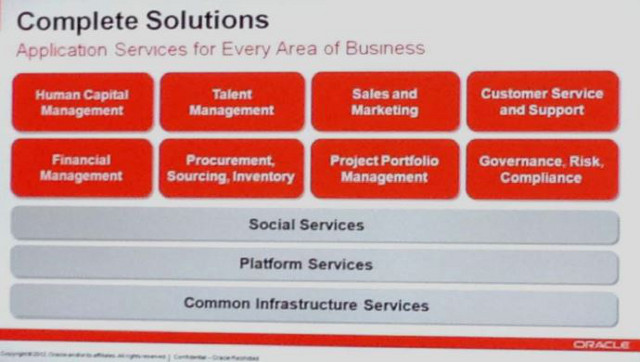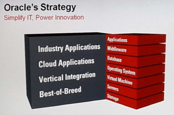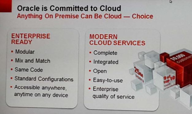 "จากนี้ไปซอฟต์แวร์ระดับแอพพลิเคชันของออราเคิลจะสามารถรันได้ทั้งบนเซิร์ฟเวอร์ภายในองค์กร (on premise) และบนกลุ่มเมฆ (cloud) โดยไม่ต้องปรับแต่งใดๆ ใช้โค้ดชุดเดียวกันหมด ตรงนี้เป็นอีกจุดขายหนึ่งสำหรับองค์กรที่ยังต้องแบ่งงานบางส่วนไว้บนเซิร์ฟเวอร์เดิม และบางส่วนไปไว้บนกลุ่มเมฆ (แนวคิดคล้ายๆ กับยุทธศาสตร์ของไมโครซอฟท์)"