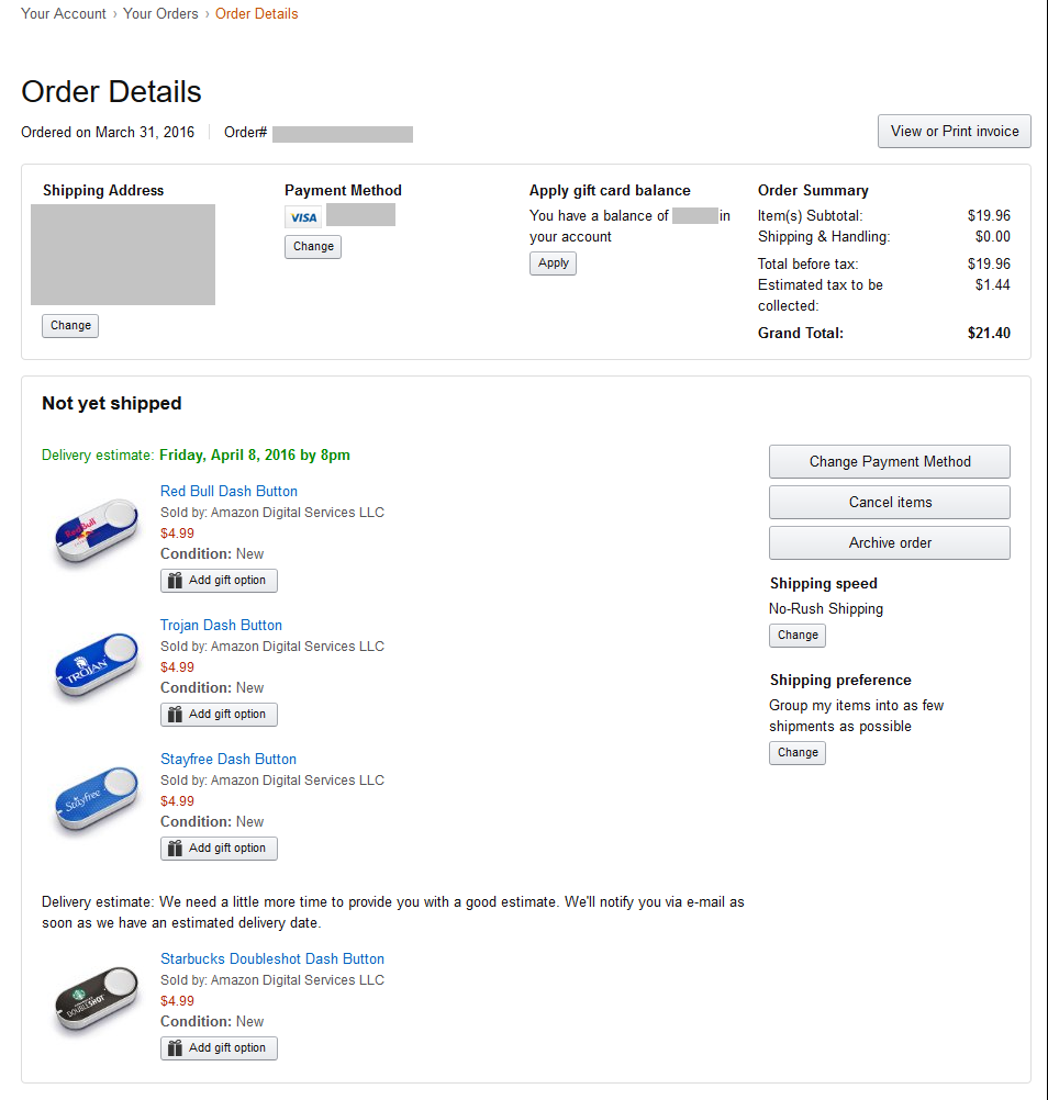ผมลองกดสั่งให้แล้ว ถุงยาง กระทิงแดง ผ้าอนามัย และก็สตาร์บัคส์ กดสั่งได้ไม่มีปัญหา จะมีที่น่าสงสัยแค่อย่างเดียวคือ สตาร์บัคส์ ยังไม่สามารถบอกวันส่งได้